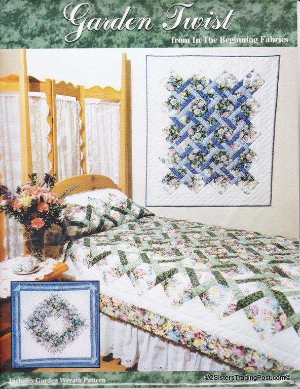 Pattern for 'Garden Twist Quilt' for In the Beginning Fabrics includes sizing and materials list for Crib/Lap 47" x 57" , Twin/Full 82" x 103", Queen/King 91" x 111" and Easy Garden Wreath wall hanging 36" x 36"