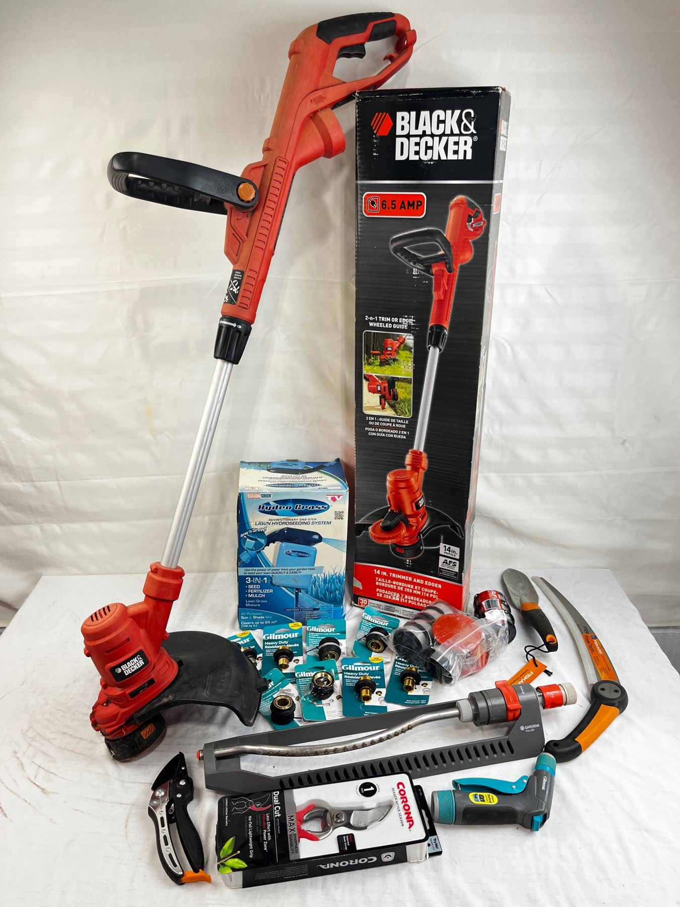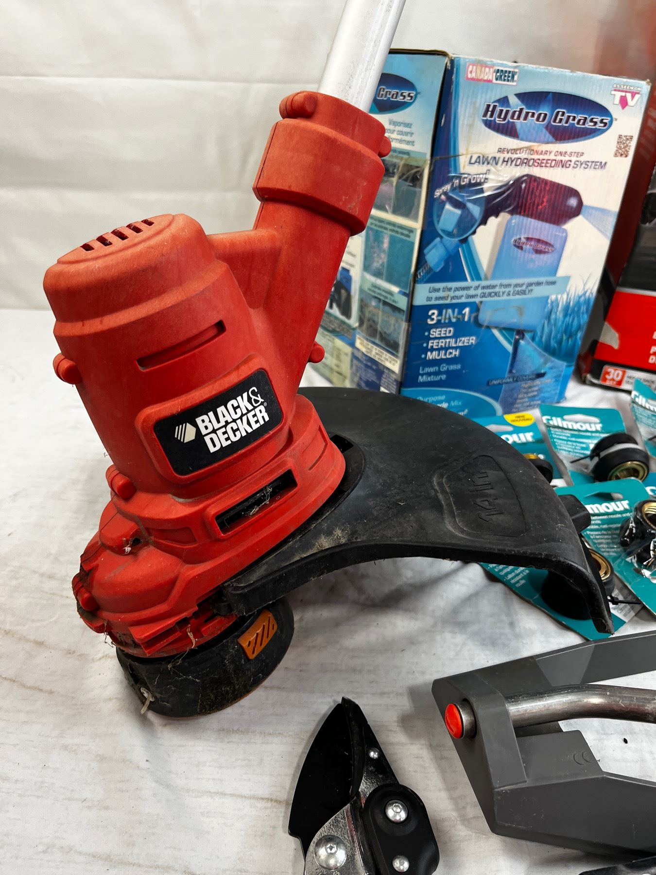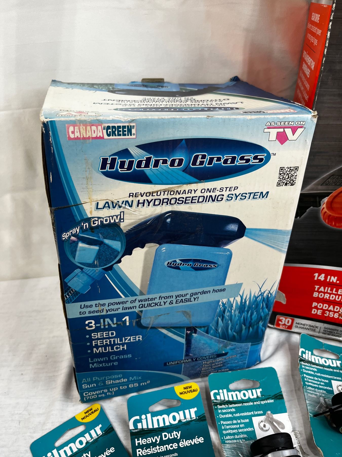 Includes Black and Decker 14" trimmer and edger, Hydro Grass lawn hydroseeding system, sprinklers, hand tools
