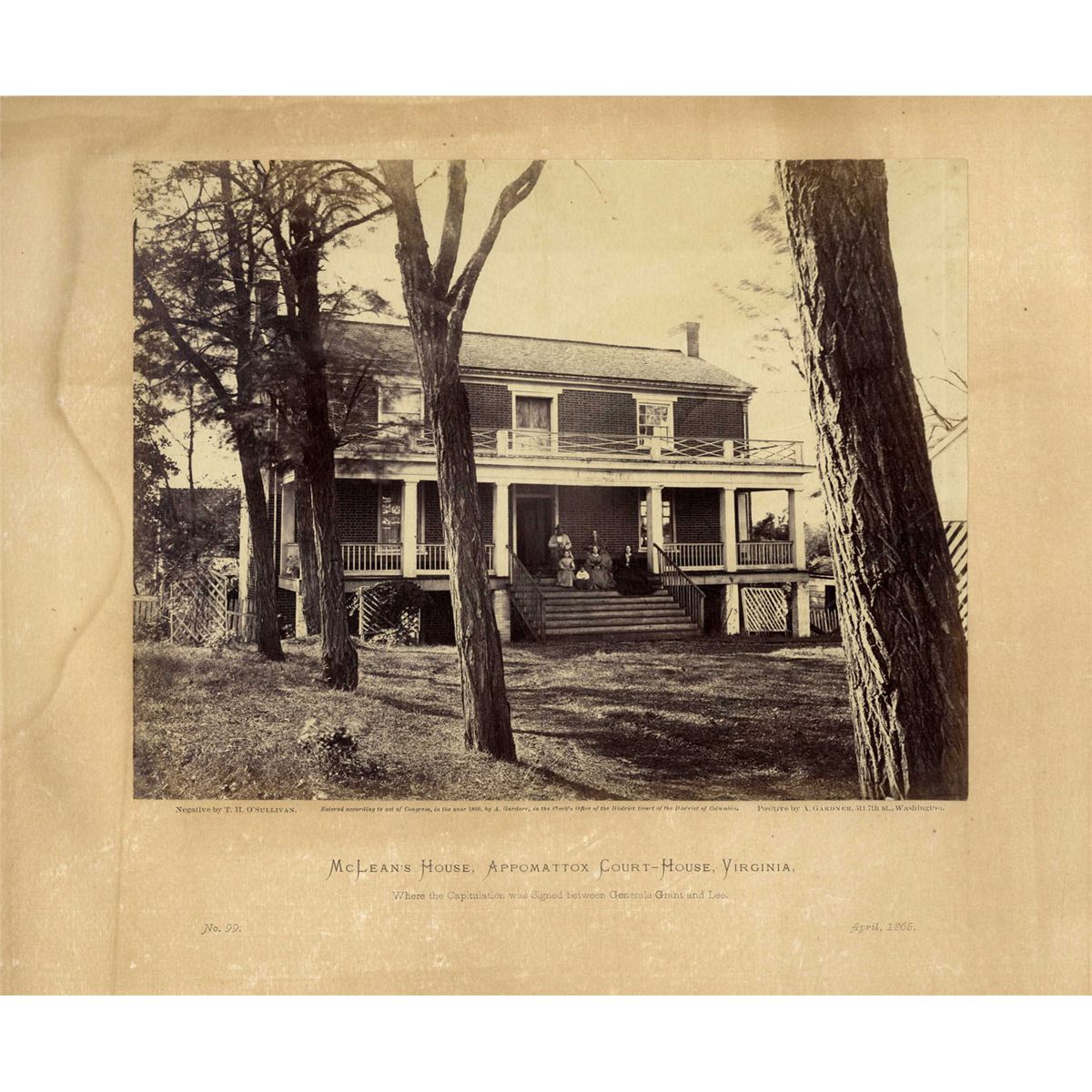 Albumen photo No. 99 from Alexander Gardner's 1866 ''Photographic Sketch Book of the Civil War'' entitled ''McLean's House, Appomattox Court-House,'' taken in April 1865 just after the conditions of surrender were signed by Generals Lee and Grant. With accompanying text from the book, remarking ''The excitement…was unparalleled, officers and men uniting in the most extravagant demonstrations of joy.'' 9'' x 7'' photo is affixed to a 16.5'' x 12.5'' book page; text is on separate page. Moisture rings to margin, not affecting photo. Near fine.