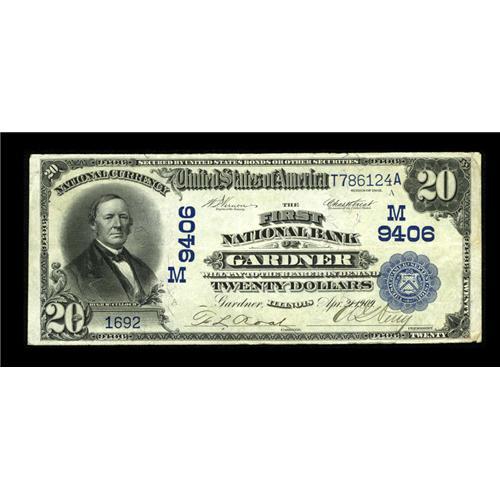 <B>Gardner, IL</B></I> - $20 1902 Date Back Fr. 644 <B>The First NB</B></I> Ch. # (M)9406<BR>This <B>Extremely Fine</B></I> note certainly could be the finest example available to collectors. It last appeared at auction in 2001 where it realized over $2000. The color is deep and the pen signatures remain strong on surfaces affected by three folds..<BR><I>From The Lincoln Collection</B></I><BR><BR><b>Shipping:</b> Coins & Currency (<a target="_blank" href="http://www.heritageauctions.com/common/shipping.php">view shipping information</a>)