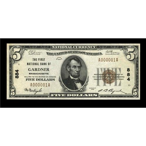 <B>Gardner, MA</B></I> - $5 1929 Ty. 1 <B>The First NB</B></I> Ch. # 884<BR>We previously sold this scarce number 1 note in our January 2004 FUN Signature Sale. It remains the only serial number 1 note on this bank and we expect when it hammers again tonight, it will realize the same or more than it did the last time around. This otherwise unused note grades <B>About Uncirculated</B></I>.