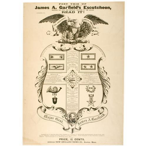 <Our item number 141029><B>[Garfield, James A.]1880 Campaign Broadside.</B> Printed by Forbes Co., Boston & New York, 25 x 18 in., printed in black on heavy paper, for the 1880 Presidential Campaign. The heading at top reads: "Post This Up - James A. Garfield's Escutcheon… READ IT!" The large broadside is tipped to a foam core board along the top edge. Very good; a few small sealed edge tears, internal creases and four large tears repaired on the back with tape. An excellent display piece. <BR>Estimated Value $250 - 350. <BR><BR>Our item number 141029<BR><IMAGES><P ALIGN="CENTER"><IMG SRC="http://www.goldbergcoins.net/liveauction/49jpegs/141029.jpg"> </P></IMAGES>