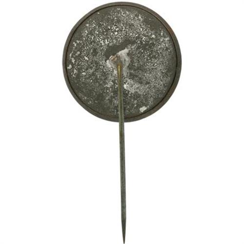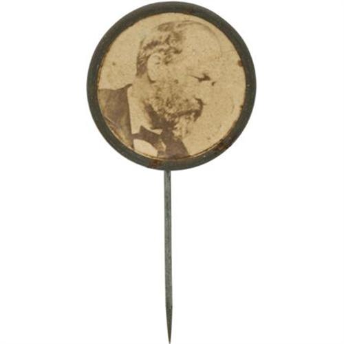 <B>Garfield Cardboard Stickpin.</B></I> Pin measures 23mm. Contains a large, bold portrait of Garfield within a plain brass rim. There appears to be a slight indentation near Garfield's forehead, which detracts nominally. Though Hancock was by far the better general, he lacked Garfield's experience as a politician. Even though generals who had never achieved elective office have been elected president, Hancock could not "cut the mustard." <BR><BR><b>Shipping:</b> Miscellaneous Collectibles, Smal (<a target="_blank" href="http://www.heritageauctions.com/common/shipping.php">view shipping information</a>)