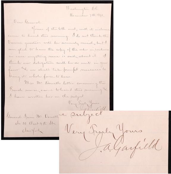 Garfield, James A. Autograph letter signed (J.A. Garfield") as a member of the House of Representatives, 1 page, 9½ x 7½", Washington, D.C., Dec. 7, 1872. To former Union General Irvin McDowell (1818-1885) in New York. In part: "…I do not think the Vienna question will be seriously raised, but I am glad to have the copy of the order in readiness in case anything more is said about it. I think our delegation will be a unit in your favor and we shall take prompt measures to bring its whole force to bear…." Fine. Accompanied by an engraving of Garfield.