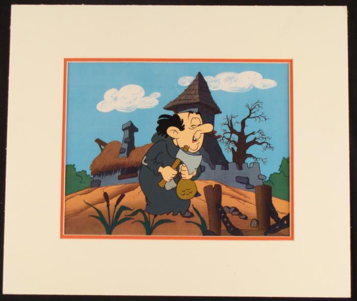 This is an original animation production cel from the 1980's television series The Smurfs. Here the villainous Gargamel is trotting across a field with an axe and a bag of something--surely up to no good! Medium: Hand painted image on acetate cel; printed background Matting: Double matted in red and whiteImage area: 9 x 11 1/2 inches Matte size: 15" x 17 1/2" Condition: ExcellentIf you love the Smurfs, you probably don't love Gargamel, but it will sure be great to have him on this terrific hand painted cel from the original series.