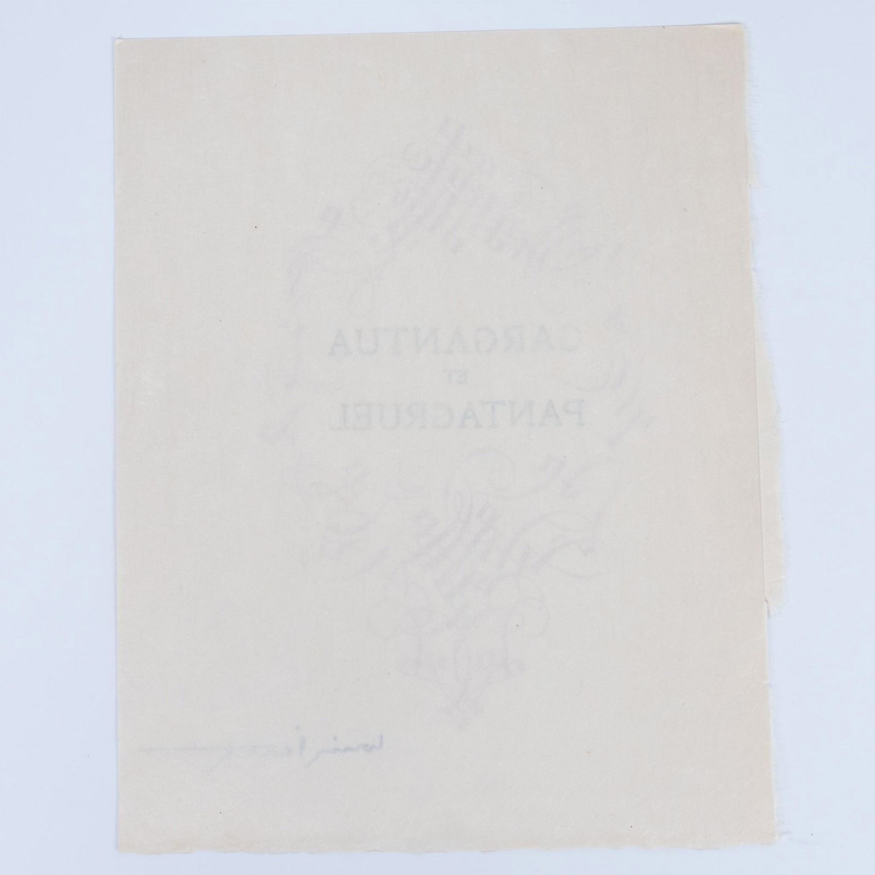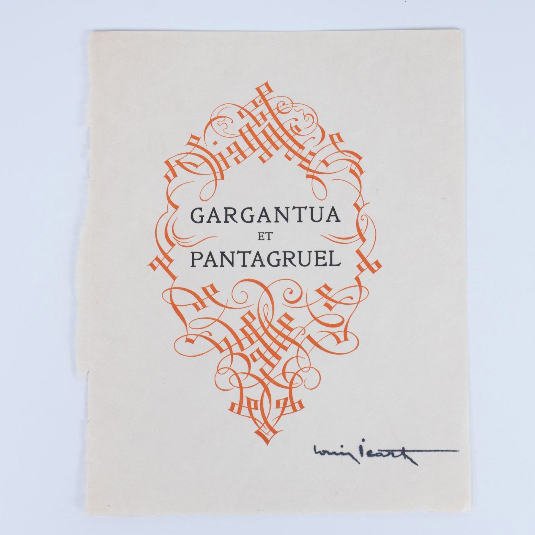 Title page for French writer Rabelais 16th century epic satire novel Gargantua et Pantagruel. Painter and illustrator Louis Icarts made a series of drawings for the novel, which were engraved on copper and printed in the workshops of Draeger Freres in Montrogue and published by Levasseur et Cie in Rue De Fleurus, Paris in 1936. Signature in plate on lower right: Louis Icart.