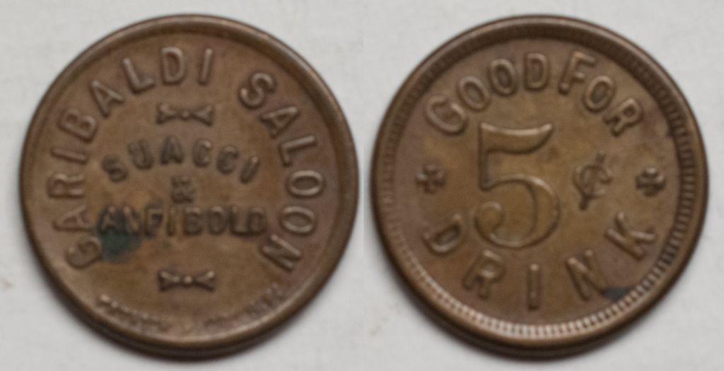 Obv.: Garibaldi Saloon / Suacci / & / Anfibolo / Patrick & Co.; rev.: Good For / 5c / Drink. Br., rd., 21mm. VF condition City: San Francisco, CA 445 Broadway