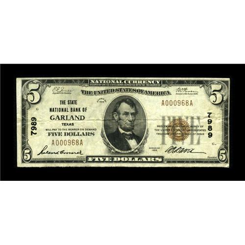 <B>Garland, TX</B></I> - $5 1929 Ty. 1 <B>The State NB</B></I> Ch. # 7989<BR>A decent small example from this well collected Dallas County suburb. <B>Very Fine.</B></I><BR><BR><b>Shipping:</b> Coin/Currency (<a target="_blank" href="http://www.heritageauctions.com/common/shipping.php">view shipping information</a>)