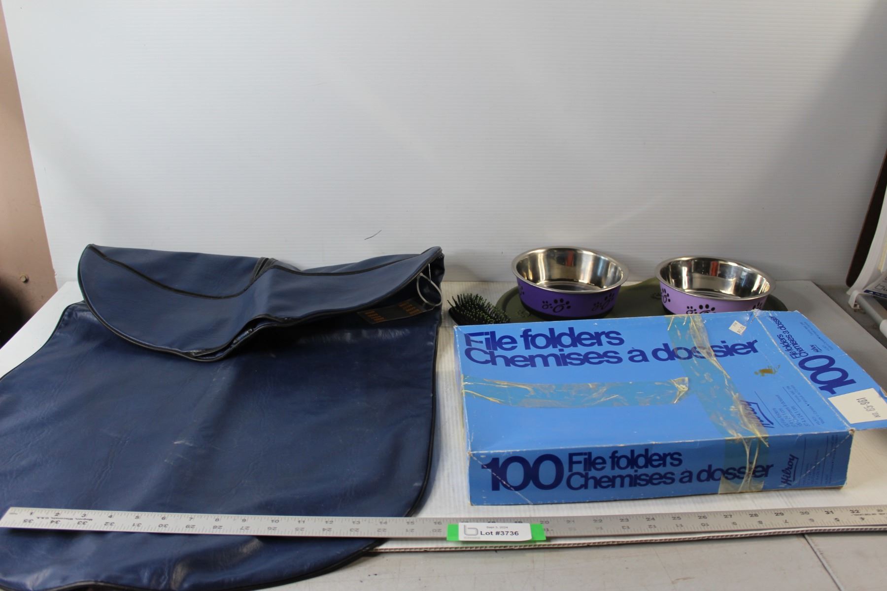Garment Bag, Dog Dish Mat with (2) Dog Dishes, Brush, Assorted File Folders