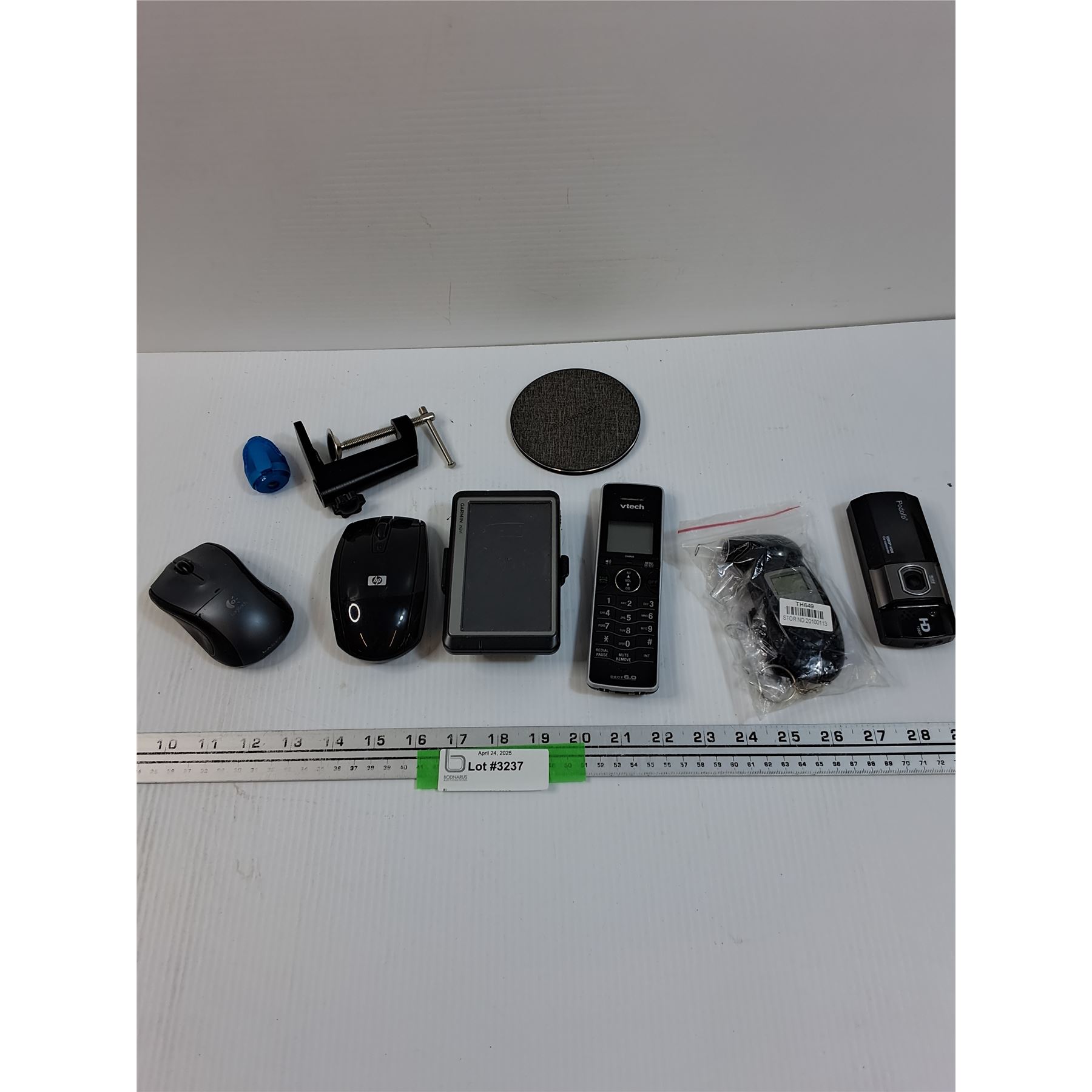 Garmin, (2) Computer Mouse, Vtech Home Phonem Desk Clamp, Podofo Camera, Wireless Charger, Misc