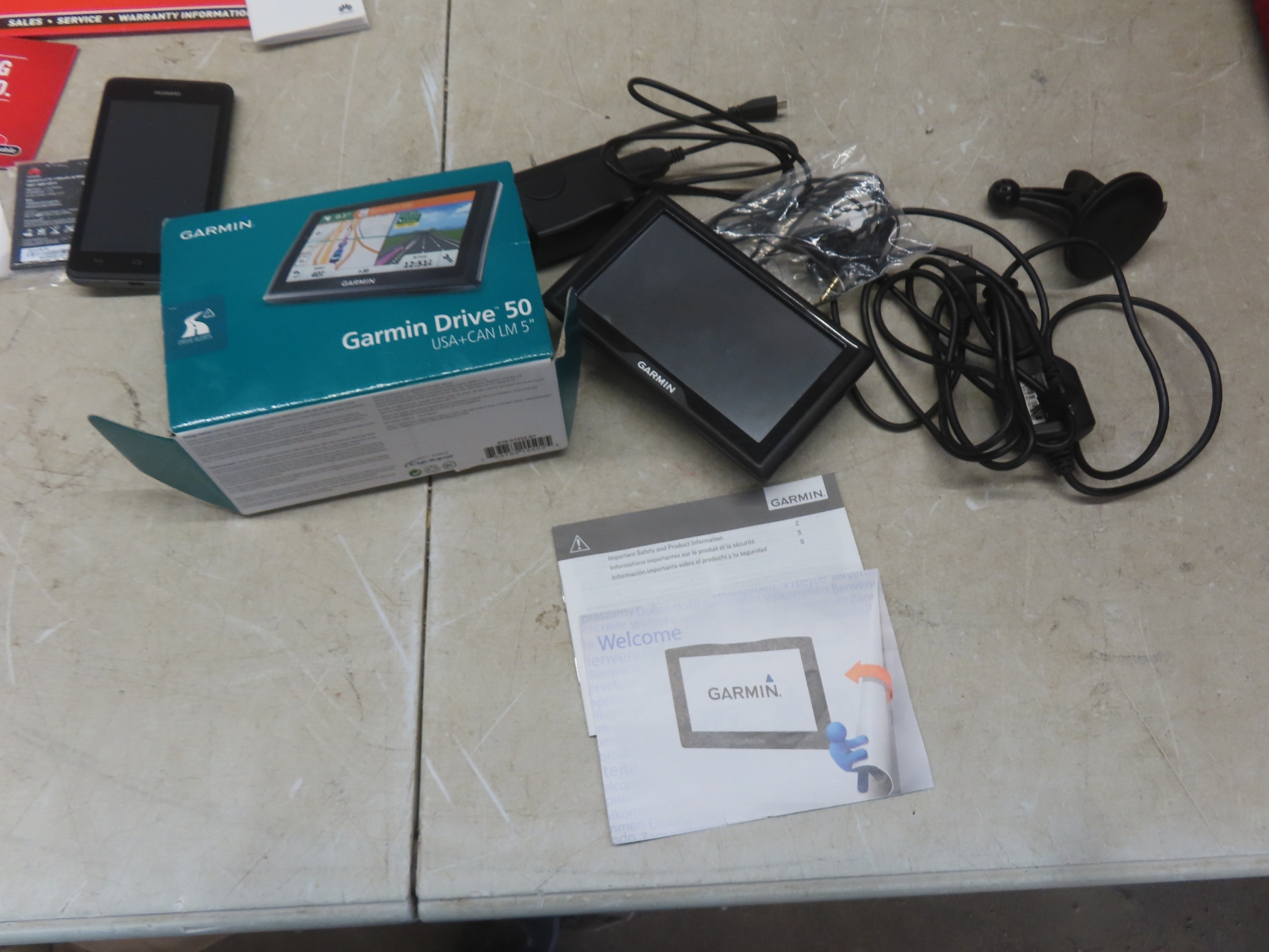Garmin Drive 50 GPS and Huawei Ascend Y530 Smartphone with Charger and Battery