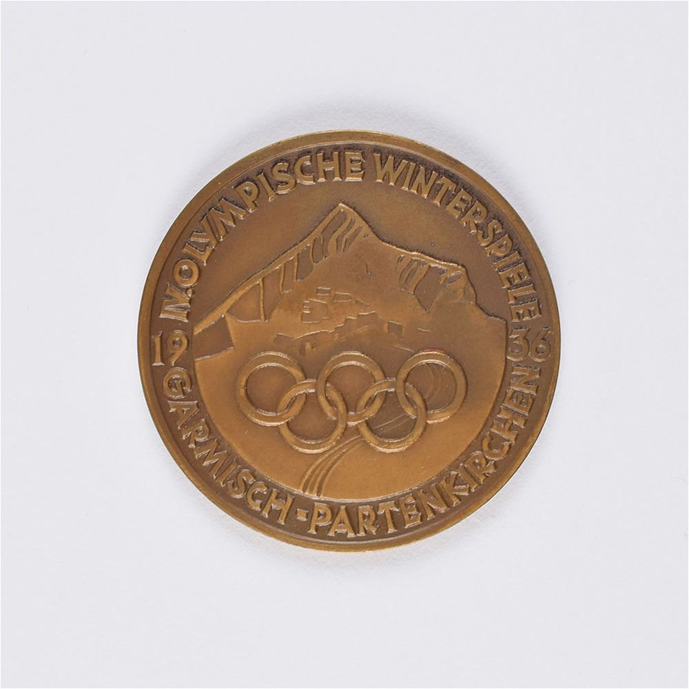 Participation medal issued for the Garmisch 1936 Winter Olympics. Bronze, 60 mm, 71 gm, by Kunststickerei M. Jorres. The front, inscribed, "Olympische Winterspiele, 1936, Garmisch-Partenkirchen," features the Olympic rings over an alpine summit; the reverse bears the Olympic motto, "Citius Altius Fortius," over a fir branch.