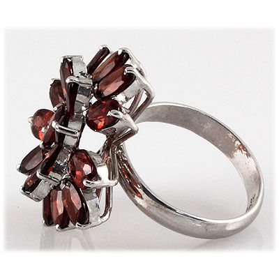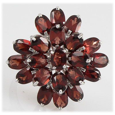 Garnet 11.55 ctw Flower Design Ring 0.925 Silver **|**|** Mainstone: Garnet ; CTW: 11.55 ; Shape: Oval Cut ; Gem Size: 6x4mm ; Metal / Purity: 0.925 Sterling Silver ; Grams: 7.59 ; MSRP: $200