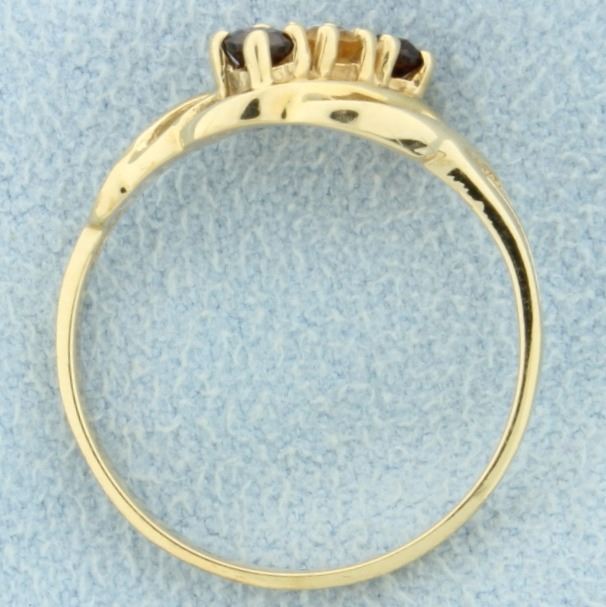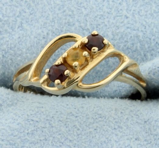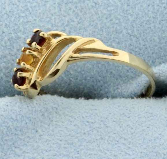 In 14K yellow gold, there are two .06ct round garnet gemstones and one .06ct round citrine gemstone. Size 6 1/2 2.0g