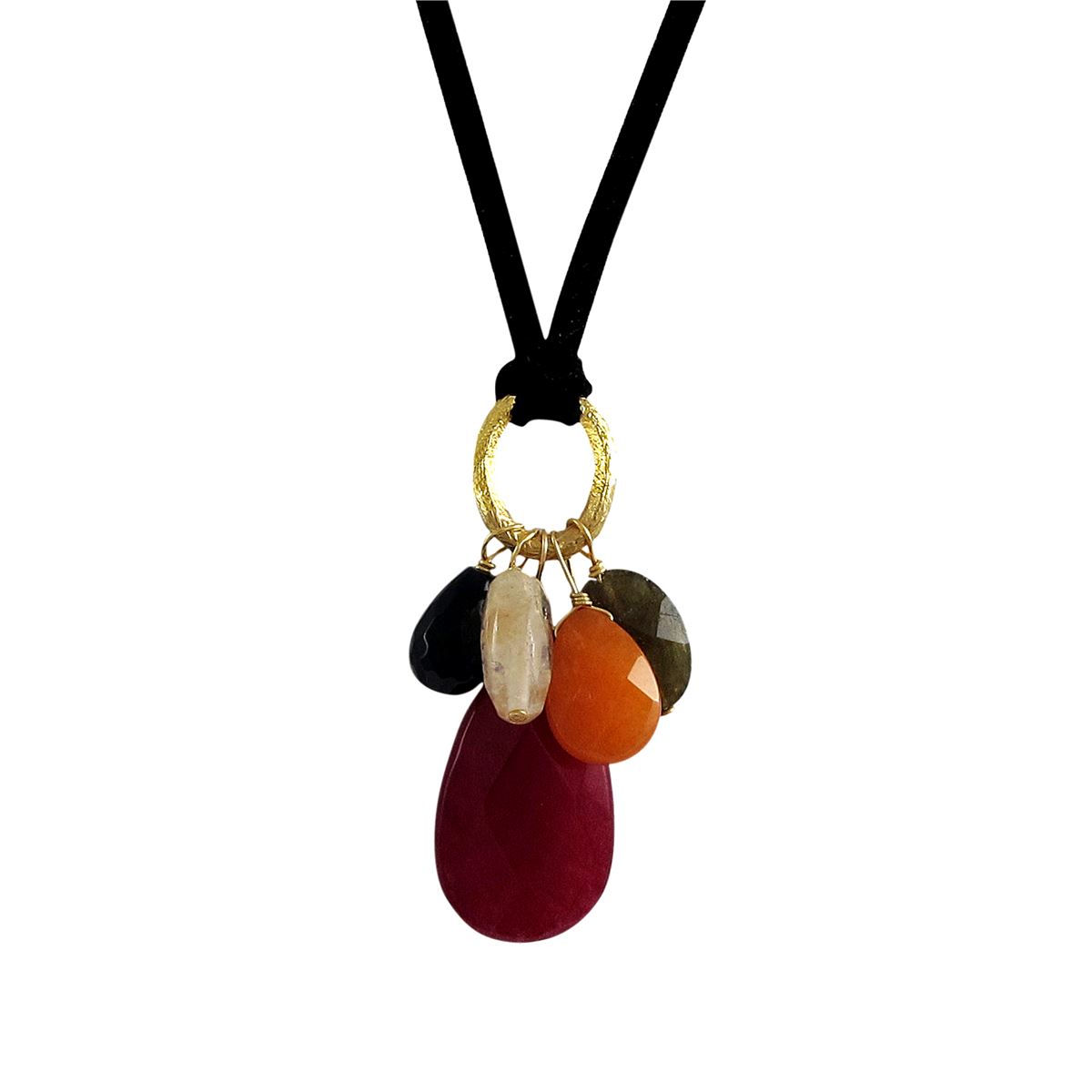 Garnet Combination Semi Precious Stones On Black Suede Chain Necklace -20"