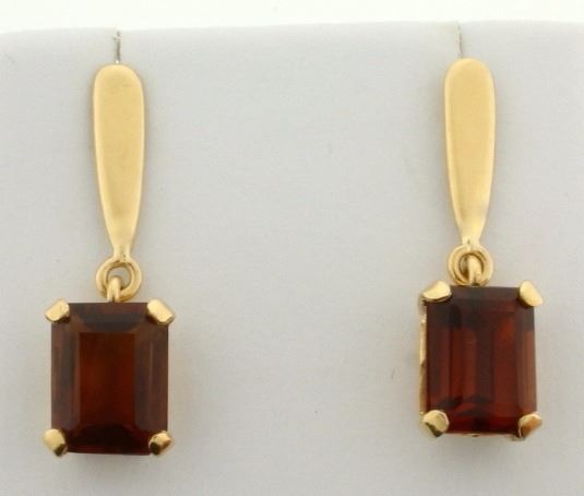 In 14k yellow gold. 1" long with friction backs. Each earring contains a high quality emerald cut 2.5ct natural garnet gemstone with beautiful red color and excellent clarity. 3.5g.