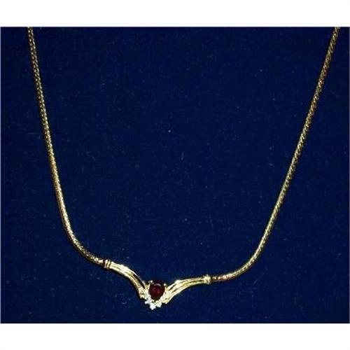 Lovely pear shaped Garnet, birthstone for the month of January, set in 14kt yellow gold is accented with brilliant diamond simulants and classified as a Chain Trim Pendant.<BR><BR>Estate disbursal acquisition in which we obtained a written Jeweler's Appraisal, stating as follows:<BR><BR>"The chain trim is set with an approximate 7x5mm AA quality purplish-red Garnet and 7 approximately 2mm round diamonds set in a V pattern at the base of the garnet. The split chain is a yellow gold flat snake style (stamped) 14kt Italy), approximately 16 inches long, 2mm wide with a lobster claw clasp. The total weight of the chain, pendant and stones equals 5.0dwts."<BR><BR>Retail Replacement Value $587.00.<BR><BR>The V section drops an additional one inch and adds 2 inches to the chain length. Estate piece of exceptional quality and condition.<BR><BR>