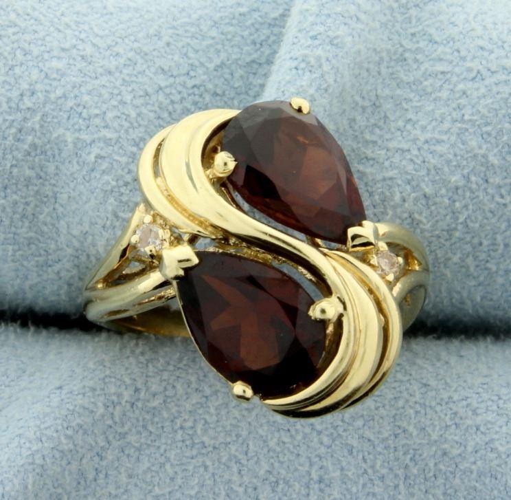 In 14k yellow gold this ring has two 10x7mm pear shaped garnet gemstones and two .02ct round diamonds. 4ct total weight. Size 6 3/4 5.6g