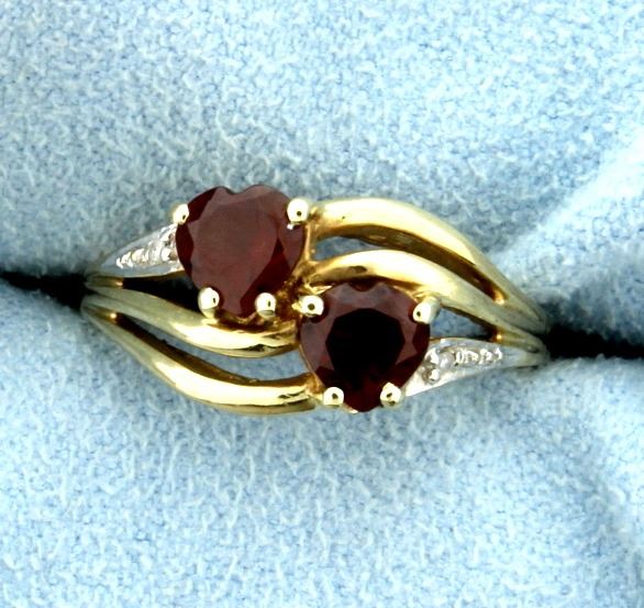 In 10K yellow gold the two 5x5mm heart shaped garnets have great color & clarity. This ring also contains two 1/2pt diamonds. Size 6 1/2 2.5g