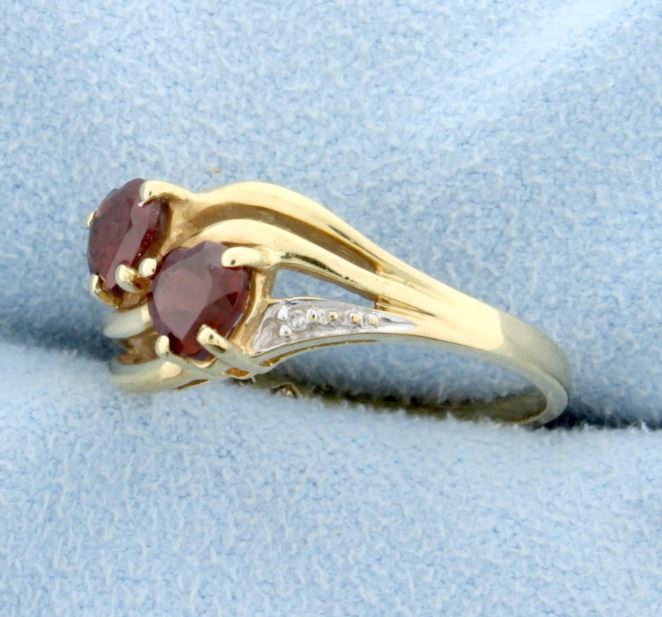 In 10K yellow gold the two 5x5mm heart shaped garnets have great color & clarity. This ring also contains two 1/2pt diamonds. Size 6 1/2 2.5g