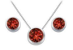 Delightful matching round bezel-set garnets stud earrings and solitaire pendant set makes a perfect gift for someone special. Both the earrings and pendant set are crafted in .925 sterling silver rhodium. These earrings come with push-back and also solitaire pendant with a standard 16 inches sterling silver chain.