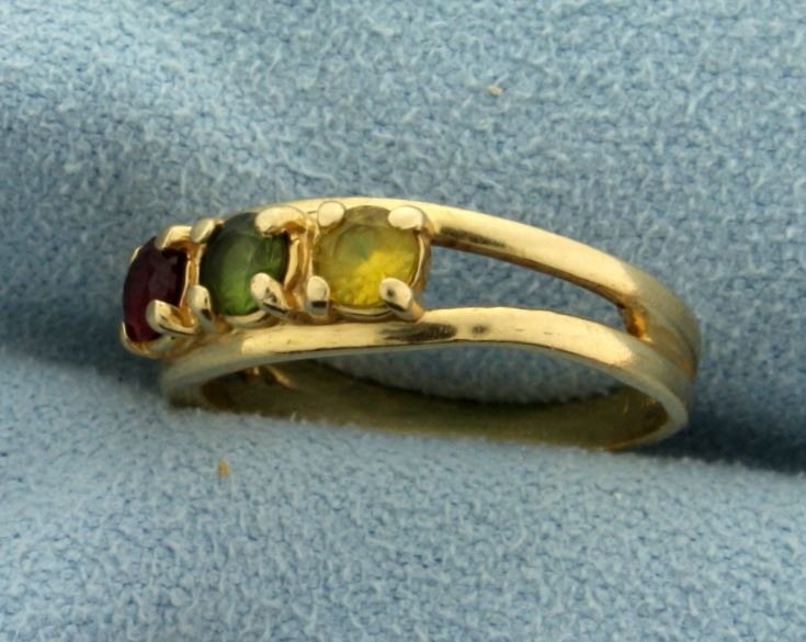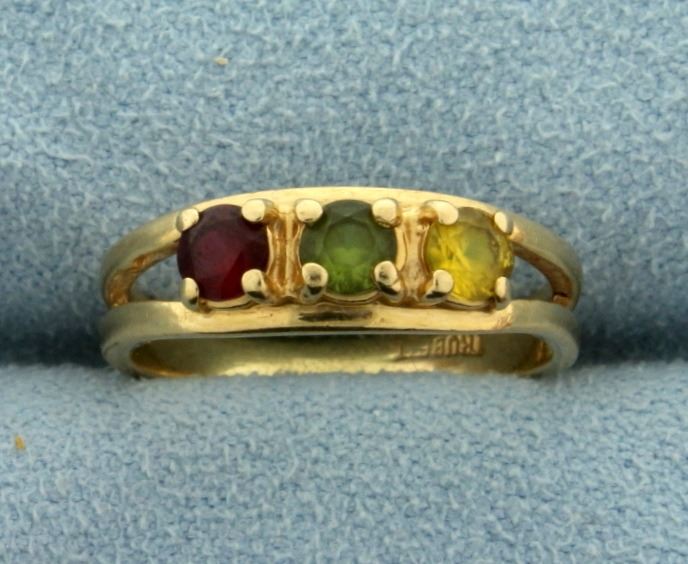 In 10k yellow gold, containing 3.5mm each of garnet, peridot, and citrine gemstones. Size 5. 2.1g.