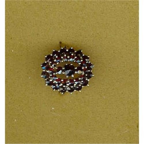 Marked "GZ" and 900 although it tests as 14k!! Also marked with what appears to be a horned animals head or a sheaf of wheat over the number "3". 16 Garnets in the outer ring, 14 garnets in the inner ring and a larger center stone with a smaller one each side. The three center stones "float" above the rings.