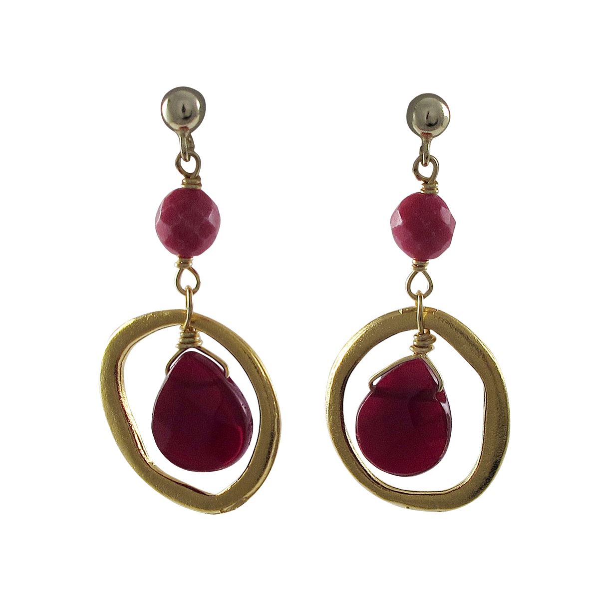 Garnet Semi Precious Stone In Gold Tone Brass Ring Sterling Silver Post Earrings -1.5"