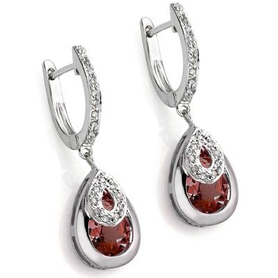 Pear cut 4.5CTW Garnet gemstones with fabulous color and clarity are set in a 1" dangle mounting with 0.01ctw genuine Diamond accents. Mounting is Platinum over Sterling Silver for added shine. Earrings are posts with latch backs for safety. 3.1g