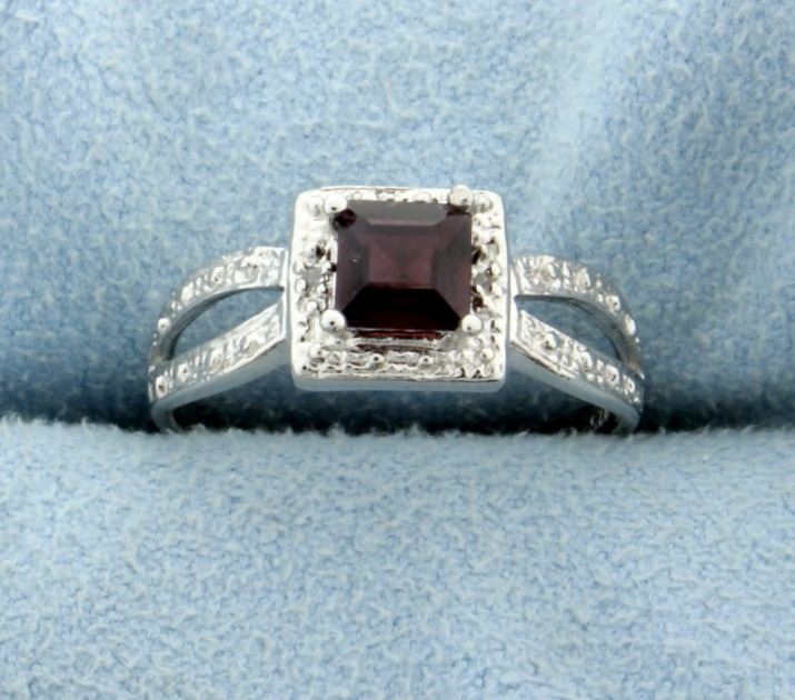 Contains 1 ct Genuine Garnet gemstone and two .01 ct diamonds. Set in platinum over a sterling silver split shank style band. Size 7.25. 2.2g.