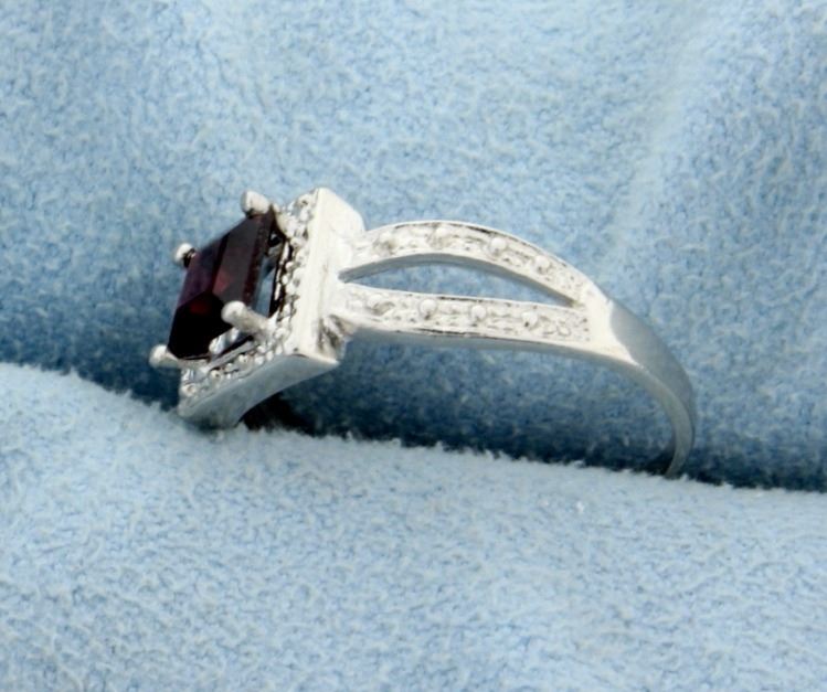 Contains 1 ct Genuine Garnet gemstone and two .01 ct diamonds. Set in platinum over a sterling silver split shank style band. Size 7.25. 2.2g.