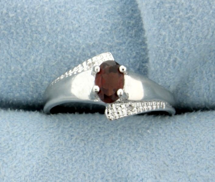 Contains Genuine 1/2 ct Oval Garnet gemstone and two .01 ct Diamonds. Set in platinum over sterling silver. Size 7.25. 2.2g.