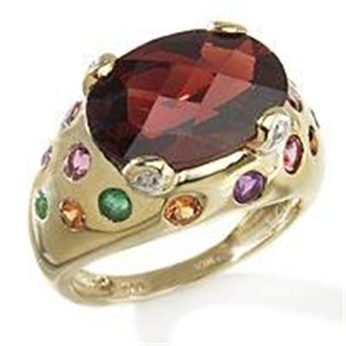 Size 8--- This ring features one 14x10mm checkerboard oval garnet surrounded by: two round cut pink tourmaline, four round cut emeralds, four round cut Hessonite garnets, four round cut amethyst, two round cut Rhodolite garnets and two diamonds. These beautiful, natural gemstones are set in durable 10kt. gold.