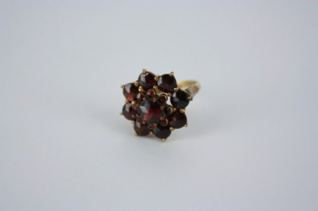 A garnet cluster ring, c.1900. gold filled cluster ring. Size 5. 0.115 t oz.
