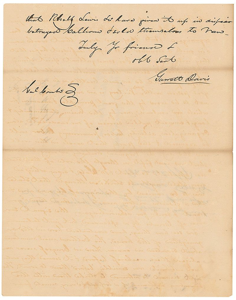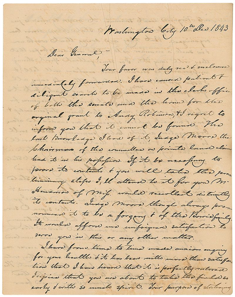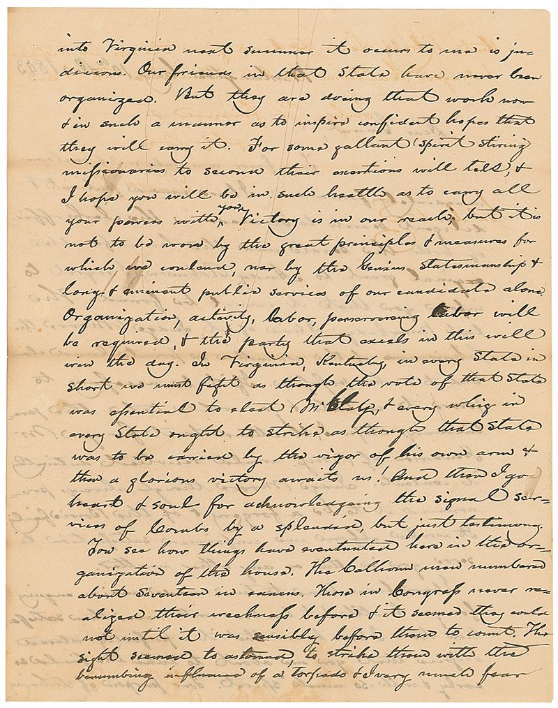 Representative and senator from Kentucky who opposed secession (1801–1872). ALS, three pages on two adjoining sheets, 8 x 10, Washington, December 10, 1843. Letter to General Leslie Combs, regarding his plan to campaign for Henry Clay in Virginia. In part: “Victory is in our reach; but it is not to be won by the great principles & measures for which we contend, nor by the Genius statesmanship & long & eminent public services of our candidate alone. Organization, labor, persevering labor will be required, & the party that excels in this will win the day. In Virginia, Kentucky, in every State in short we must fight as though the vote of that State was essential to elect Mr. Clay, & every whig in every State ought to strike as though that State was to be carried by the vigor of his own arm & then a glorious victory awaits us!” Intersecting folds with trivial separations (one vertical fold passing through a single letter of the signature), light overall toning, and show-through from writing to opposing sides, otherwise fine condition.