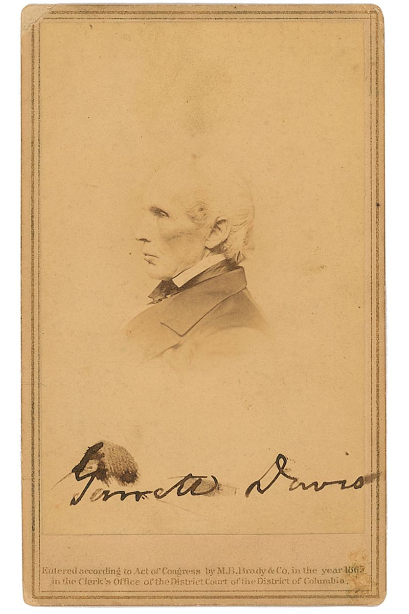 Representative and senator from Kentucky who opposed secession (1801–1872). Original 2.25 x 4 carte-de-visite portrait of Davis in profile, signed at the bottom of the image in black ink. Published by M. B. Brady & Co. of Washington. Chip to upper left corner and brushing to beginning of signature, otherwise fine condition.