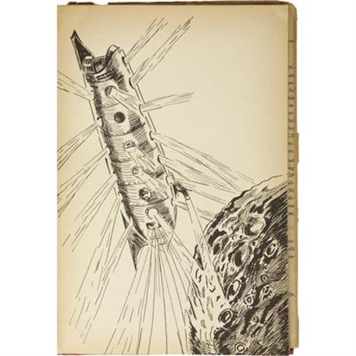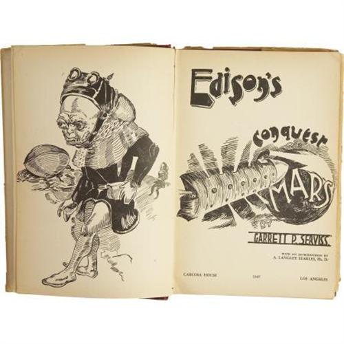 <B>Garrett P. Serviss. </B></I><B><I>Edison's Conquest of Mars</B></I></B></I>. Los Angeles: Carcosa House, 1947. <BR>First edition. One of 1,500 copies of the limited first edition. Octavo. 186 pages plus Bibliography of Serviss.<BR><BR>Publisher's maroon cloth with gilt spine titles. In original pictorial dust jacket, utilized on the remaindered copies not sold directly from the publisher. Minor toning and moderate bumping to the board edges. Spine titles lightly faded. Text overall very clean. Dust jacket, rarely seen on the book, worn at all four folds, with the front flap detached. Spine ends noticeably chipped. Overall, a good, solid copy of a scarce science fiction title.<BR><BR>Accompanied by an original four-page solicitation for the book in the original Carcosa House envelope. The ad is in fine condition, with the envelope showing minor wear.<BR><BR>"First serialized in the New York <I>Evening Journal</B></I> in 1898, this was intended as a sequel to Wells' <I>The War of the Worlds</B></I>, which had been published in <I>Cosmopolitan </B></I>in 1897. Although technical detail and explanation are dismissed, the novel becomes a eulogy to the inventiveness of Edison. Except for giantism, evolution on Mars parallels that of Earth." (Barron: <I>Anatomy of Wonder</B></I> [1976] 72).<BR><BR><b>Shipping:</b> Books & Catalogs (<a target="_blank" href="http://www.heritageauctions.com/common/shipping.php">view shipping information</a>)