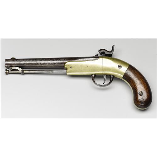 <B>Garrett Single Shot Pistol</B></I> about .58 caliber, serial number 25. These brass framed pistols have long been attributed to J&F Garrett of Greensboro, NC where approximately 500 were made before the Civil War. Typically unmarked, this pistol bears stampings on the 8.5 inch barrel of "US / S.K / P" from the U.S. Model 1842 pistol barrels used by the Garretts. The serial number is evident on the backstrap under the left grip panel. The steel barrel exhibits a speckled brown patina with some minor scrapes on the top. The brass is slightly pitted in some spots, especially the backstrap, but shows an overall even golden tone. The grips appear original with expected dings and dents. The pistol is in overall mechanically fine condition. <BR><BR><B>Kent Wall's Report:</B></I> <BR>Speculation as to the origin of the brass frame, single shot, percussion pistol continues to this day. Many collectors and authors attribute this to the firm of J. and F. Garrett and Company, Greensboro, North Carolina, therefore the designation. <BR>The surviving specimens are similar in many respects, including the swivel ramrod, typically found on the Model 1842 U. S. pistol, grips of wood, brass, one piece grip strap and the serial number stamped on the left side of the upper part of the strap. <BR>The highest known serial number is 505. <BR>Since the barrels are all from the Model 1842 pistol, Albaugh/Benet/Simmons believed these barrels were likely on hand at the Fayetteville Armory and were shipped out in 1861 to make room for the rifle machinery from Harpers Ferry. <BR>This .54 caliber pistol has a round, iron barrel, 8 ½" in length. The barrel markings are "U.S." over "S. R." over "P". The swivel ramrod is mechanically sound and is 8 ¾" long. Frame and one piece strap are brass as is the blade front sight. SN "25" is stamped on the left side of the upper strap under grip. <BR>Grips are 2 piece walnut and appear to be original. Written in pencil on the back of the left grip is "D. Hastings", over "Natick Mass" over "1929". <BR>Condition: Good. Iron parts exhibit a mottled gray appearance with light and dark patches. Hammer will not lock at full cock. Brass parts have been cleaned and exhibit minor dings, scratches and discoloration.<BR><BR><b>Shipping:</b> Large Collectibles (<a target="_blank" href="http://www.heritageauctions.com/common/shipping.php">view shipping information</a>)
