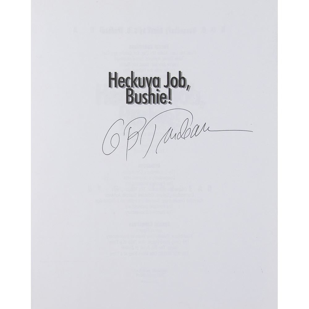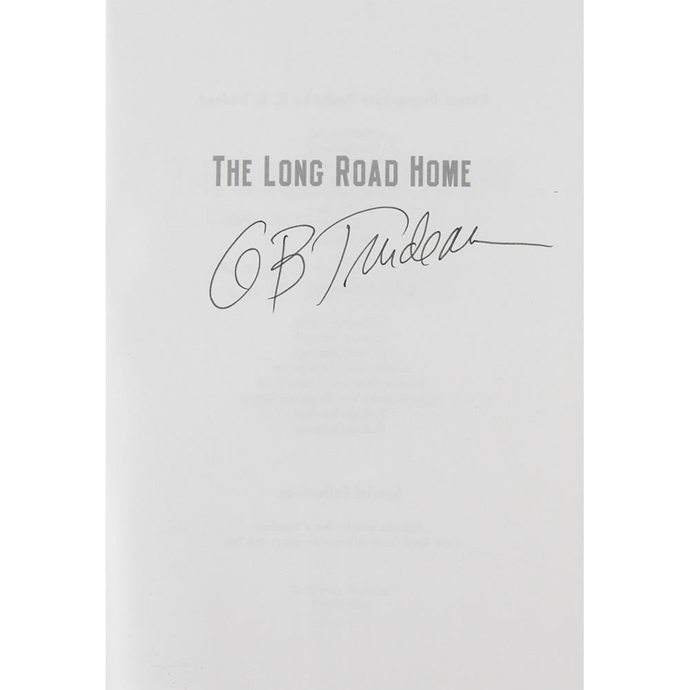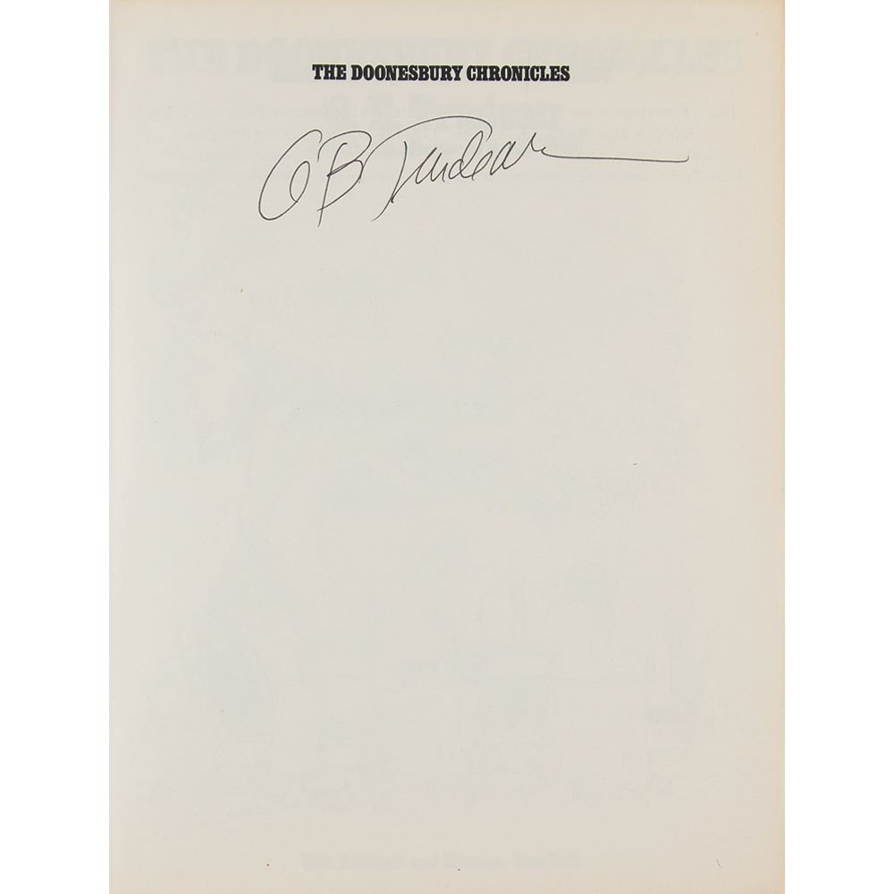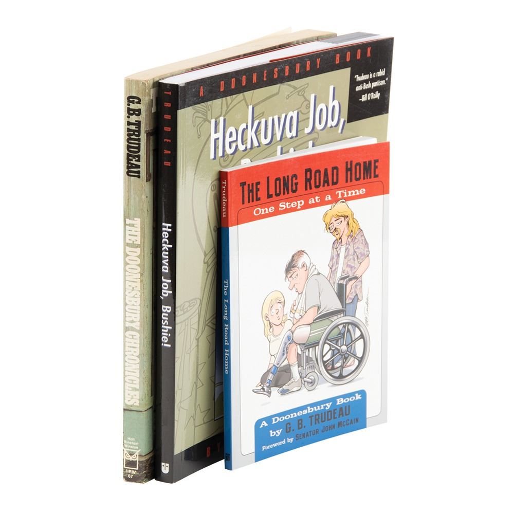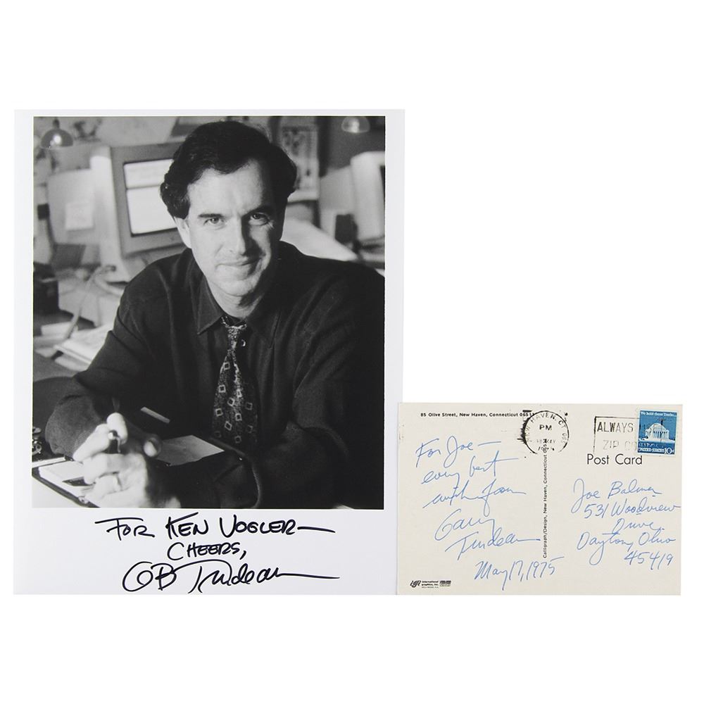 Five items signed by American cartoonist Garry Trudeau, creator of Doonesbury: a personal postcard depicting his desk in New Haven, signed and inscribed on the reverse in ink, and dated May 17, 1975; a satin-finish 8 x 10 portrait, signed and inscribed in the lower border in black felt tip; and three softcover books—The Doonesbury Chronicles, Heckuva Job Bushie!, and The Long Road Home—each signed on the half-title page in black ink. In overall fine condition.