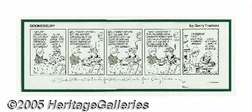 <B>Garry Trudeau - Doonesbury Daily Comic Strip Original Art, dated 11-15-75 (Universal Press Syndicate, 1975).</B></I> Doonesbury and Zonker's dad discuss family legends in this smile-inducing early daily from the Pulitzer Prize-winning series. The image area measures 14.5" x 4.5" and is signed in the lower margin "For Rhonda White -- all best wishes from Garry Trudeau." The art is in Excellent condition.