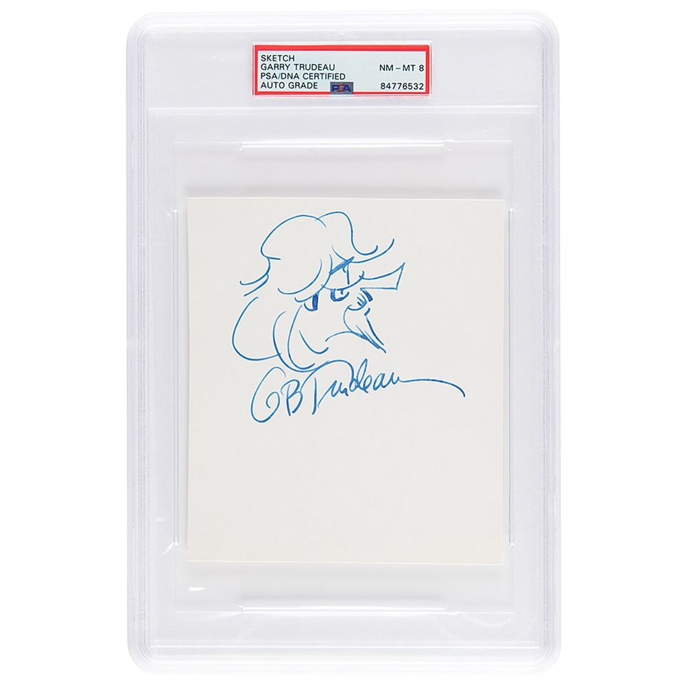 Original felt tip sketch of Zonker Harris on a white 4.75 x 5.5 card, signed "G. B. Trudeau." In fine condition. Encapsulated and graded by PSA/DNA as "NM-MT 8."