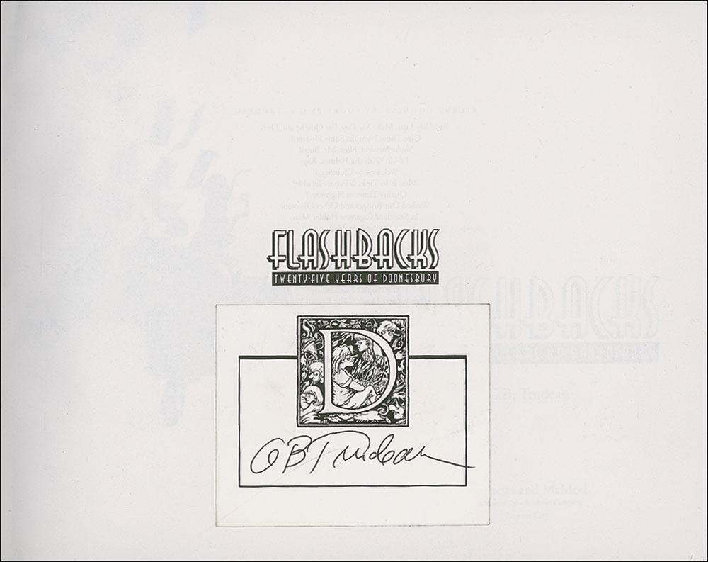 Signed book: Flashbacks: Twenty-Five Years of Doonesbury. First edition, first printing. Kansas City: Andrews and McMeel, 1995. Softcover with slipcase, 11 x 8.5, 331 pages. Signed in black felt tip on a bookplate affixed to the half-title page. In fine condition, with light wear and rubbing to dustjacket.