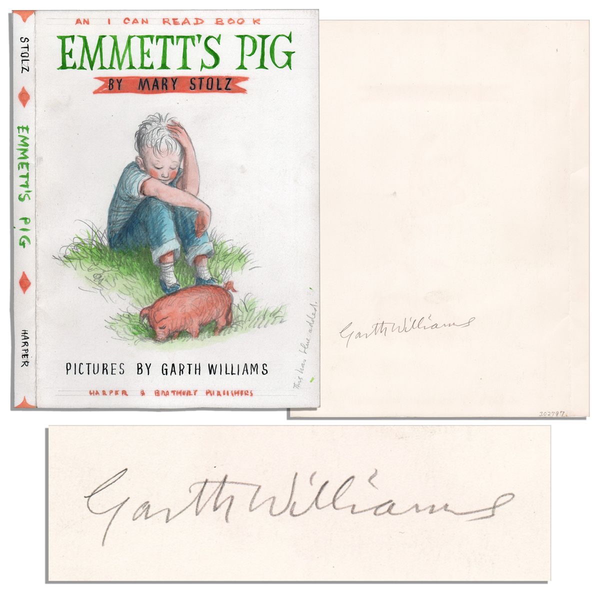 Garth Williams signed artwork -- done in pencil, watercolor and ink -- of his cover illustration for ''Emmett's Pig.'' The artist, whose endearing drawings have filled the pages of such classics as ''Little House on the Prairie'' and ''Charlotte's Web,'' signs ''Garth Williams'' in pencil to verso. Mary Stolz's touching tale about a city boy who wants a pet pig was first published in 1959 by Harper & Brothers, likely dating this drawing to 1958 or 1959. In the final edition of this cover art, Williams embellished the background with foliage, changed Emmett's blue striped shirt to red plaid and revealed more of Emmett's and the pig's faces by tilting their chins slightly. Artwork measures 6.75'' x 8.75''. Pencil notation, likely by Williams, to lower right reads: ''This one has blue added.'' Light smudging from graphite. Near fine.