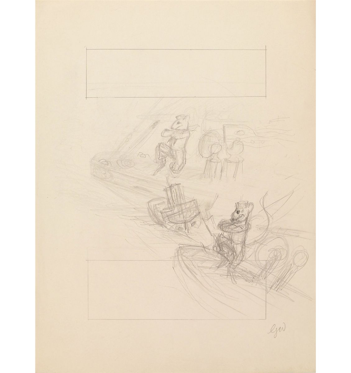 Artist best known for his illustrations in children’s books (1912–1996). Original vintage signed pencil sketch of mice dressed in Navy uniforms dancing on small boats for Stuart Little on an off-white 12 x 16 sheet, signed in the lower right, “G. W.” In fine condition.