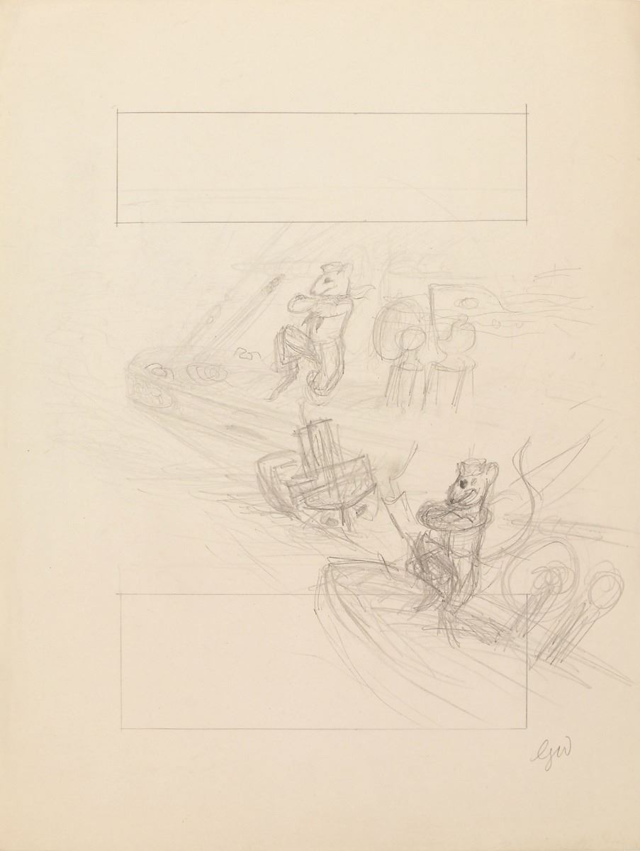 Artist best known for his illustrations in children’s books (1912–1996). Original vintage signed pencil sketch of mice dressed in Navy uniforms dancing on small boats for Stuart Little on an off-white 12 x 16 sheet, signed in the lower right, “G. W.” In fine condition.
