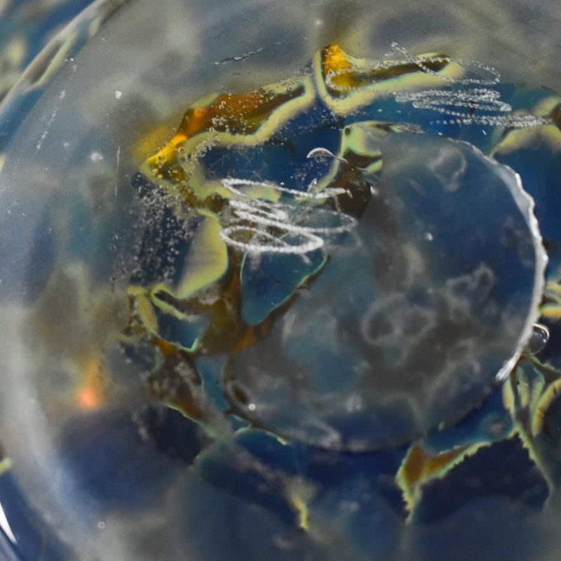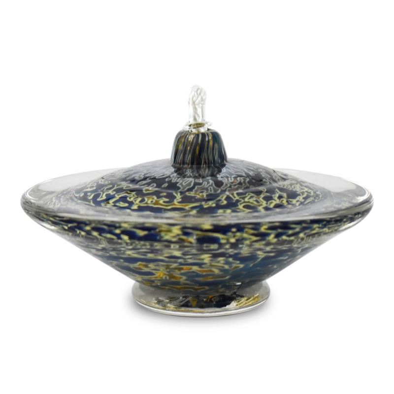 This hand-blown "Small Saturn Oil Light" features a fiberglass wick to get you started, and when lit, the lamp casts a glowing ring of firelight, evoking the rings of majestic Saturn. This one-of-a-kind oil lamp is by GartnerBlade Glass. Measures approx. 5" (diameter) x 3" (height).