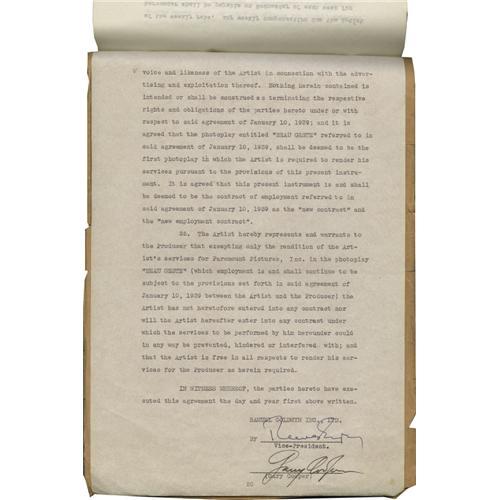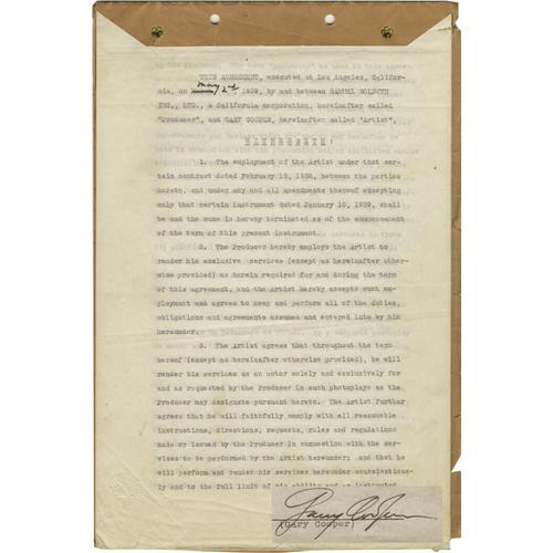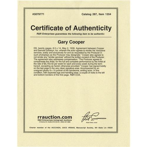 <B>Gary Cooper Signed Contract.</B></I> A 20-page employment agreement dated May 2, 1939, between Cooper and Samuel Goldwyn Inc., signed by Cooper on the last page in black ink. In Fine to Very Fine condition with mild to moderate overall tanning and wear. Also included is a b&w 8" x 10" photo of Cooper. <I>Accompanied by LOA from PSA/DNA.</B></I><BR><BR><b>Shipping:</b> Flat Material, Small (<a target="_blank" href="http://www.heritageauctions.com/common/shipping.php">view shipping information</a>) <BR><BR><B>Important notice
