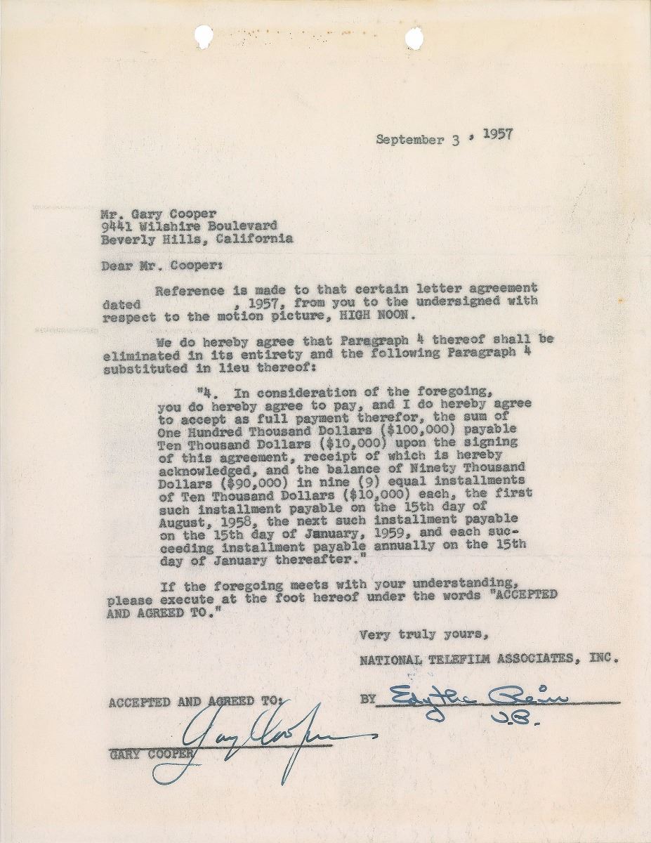 DS, one onionskin page, 8.5 x 11, September 3, 1957. Document related to the agreement between National Telefilm Associates and Gary Cooper regarding his salary “with respect to the motion picture, High Noon.” Boldly signed at the conclusion by Cooper. In fine condition. One of Cooper’s greatest films, High Noon received numerous accolades and Cooper won the 1953 Academy Award for Best Actor in a Leading Role for his portrayal of Wild West lawman Marshal Will Kane.