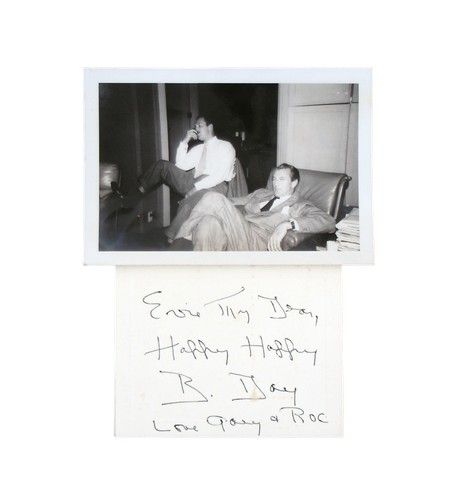 Gary Cooper Signed Handwritten Note & Photo - One of the all time great iconic legends of Hollywood, Gary Cooper, was married to one wife for his entire adult life. Her name was Veronica Cooper. She also went by the name of Sandra Shaw as an actress (though her only real claim to fame is being the blond that is dropped by King Kong in the original 1933 classic). However Gary and her friends called her Rocky or just Roc. Veronica was truly a "stand by your man" woman, since Cooper was known as one of the most active ladies men in Hollywood. Virtually every female star of the time (as well as just regular "civilian" women he'd meet on a daily basis), had a moment or more with him in the bedroom, and he also had several long standing "mistress" relationships with some of the most famous actresses and socialites in town. He loved to travel in a circle of select friends who seemed to look the other way during his many dalliances. Among this group was Van Johnson and his wife Evie, as well as Kennan Wynn (who was original married to Evie until she left Kennan for Van). This is a rare handwritten note that Gary Cooper wrote (and which was occupied by a massive flower gift basket) to Evie for her birthday party held at her and Van's house. Cooper writes: "Evie my dear, Happy B. Day - Love Gary & Roc". Along with the note is a personal photograph, taken by Van of Gary Cooper and Keenan Wynn at the party, in very casual poses. Quite rare to see Gary from his personal life. The photo comes directly from Van Johnson's personal family album. It comes from Van Johnson’s personal collection, and includes a Letter of Provenience from the Johnson’s daughter, Schuyler Johnson along with a copy of her famous controversial cover story article “My Life As A Hollywood Princess”, about her trials and tribulations growing up in Beverly Hills with a superstar father and extended “family” with some of the most famous celebrities in the world. The handwritten note is approx 4"x 3" and the family photo is approx 5"x 3.5".