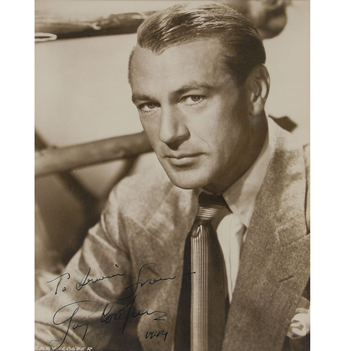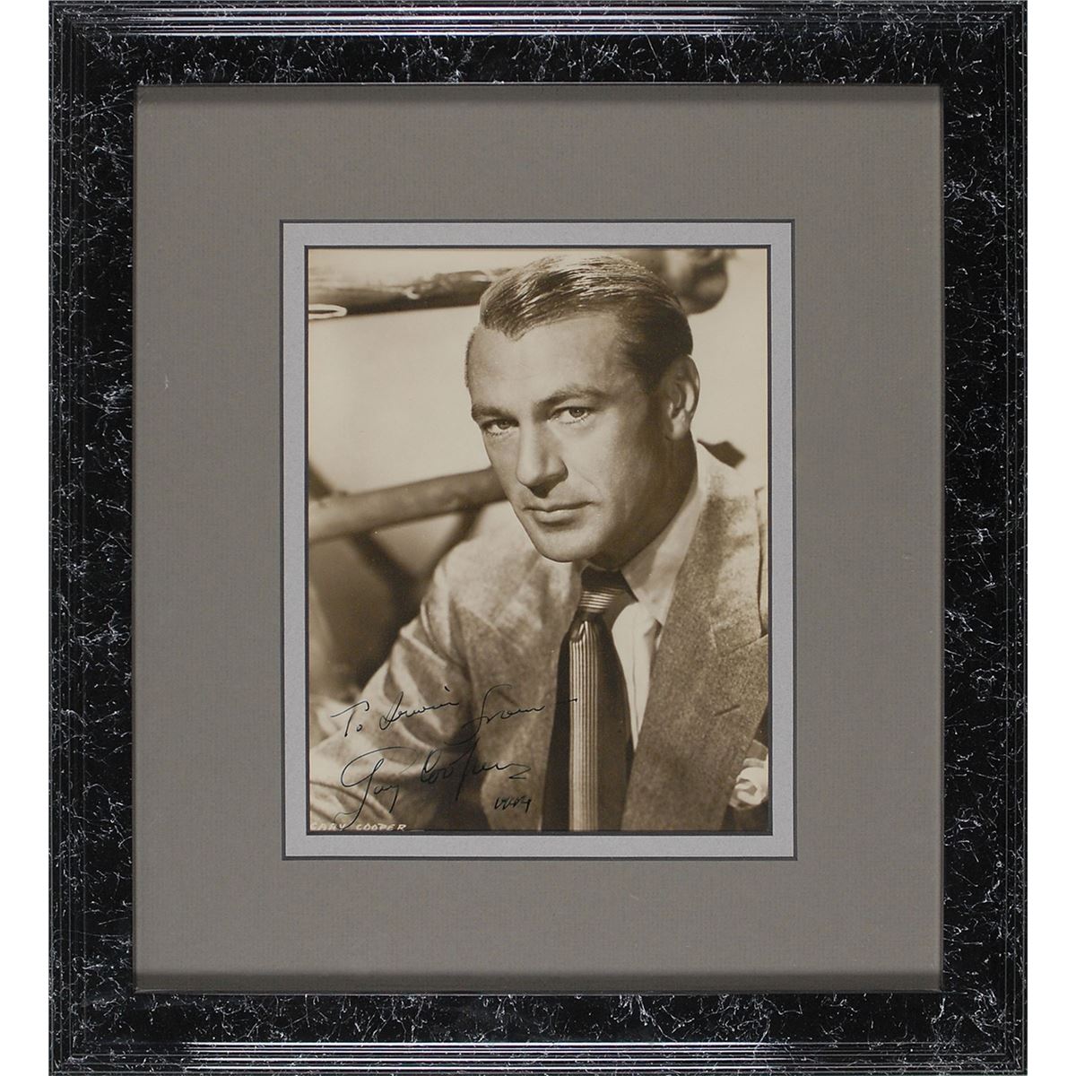 Refined vintage glossy 7 x 8.75 portrait of Cooper with his hair neatly slicked back, signed and inscribed in fountain pen, “To Irwin, from—Gary Cooper, 1944.” Double-matted and framed to an overall size of 15 x 16.5. In fine condition. An exceptionally handsome image of Cooper, who, at the time of the signature, helped form International Pictures, a production company which he ultimately sold to Universal Studios two years later. The James Collings Collection.